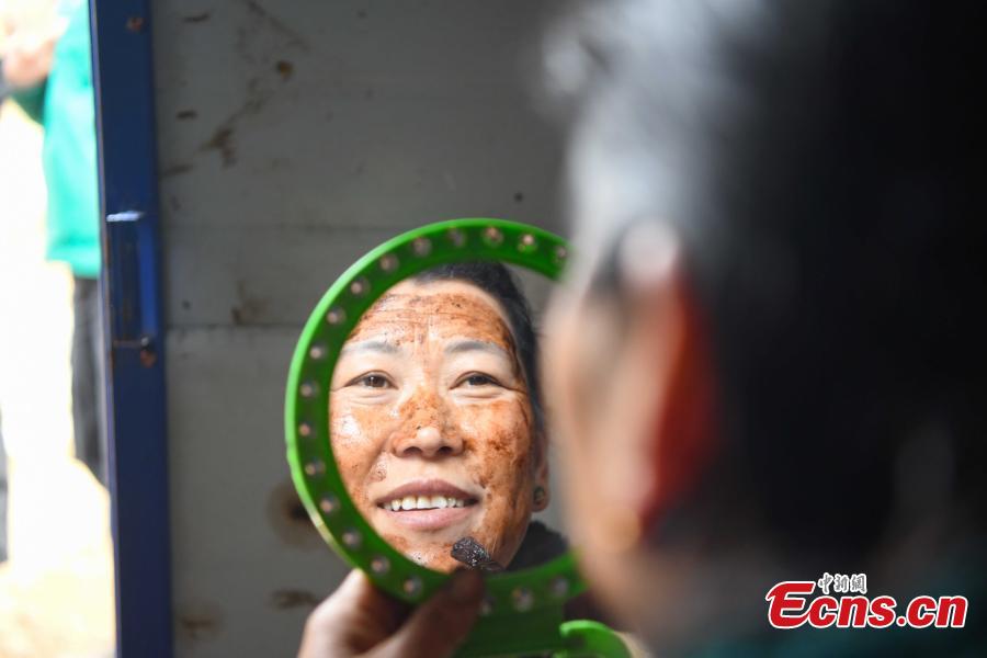 A villagers applies homemade sunscreen to their face before collecting caterpillar fungus in Gyaca County, southwest China's Tibet Autonomous Region, April 22, 2022. Caterpillar fungus has entered the annual harvest season in Tibet. (Photo/China News Service)