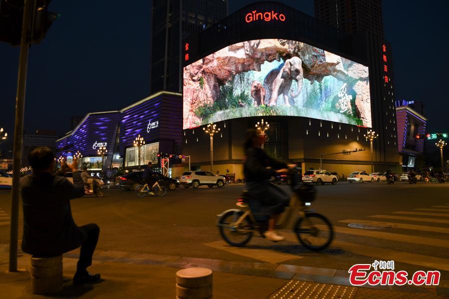 A naked eye 3D video featuring Asian elephants is displayed on a large outdoor screen, bringing residents an immersive audio-visual experience in Kunming, southwest China's Yunnan Province, April 23, 2022. (Photo: China News Service/Liu Ranyang)