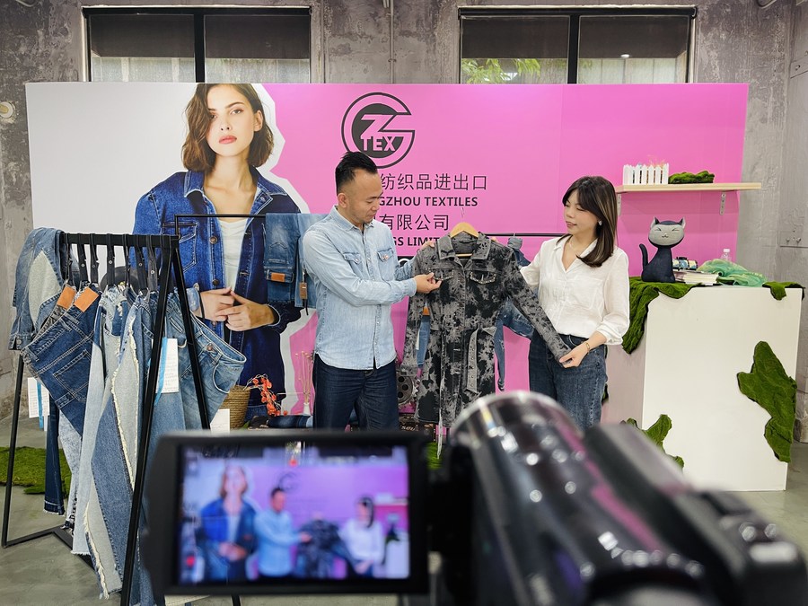 Exhibitors introduce products on a livestream at the booth of Guangzhou Textiles Holdings Limited during the China Import and Export Fair in Guangzhou, south China's Guangdong Province, April 15, 2022. (Xinhua)