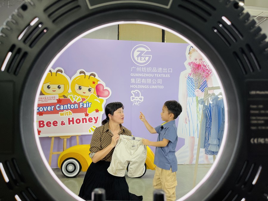 An exhibitor interacts with a child on a livestream at the booth of Guangzhou Textiles Holdings Limited during the China Import and Export Fair in Guangzhou, south China's Guangdong Province, April 21, 2022. (Xinhua)