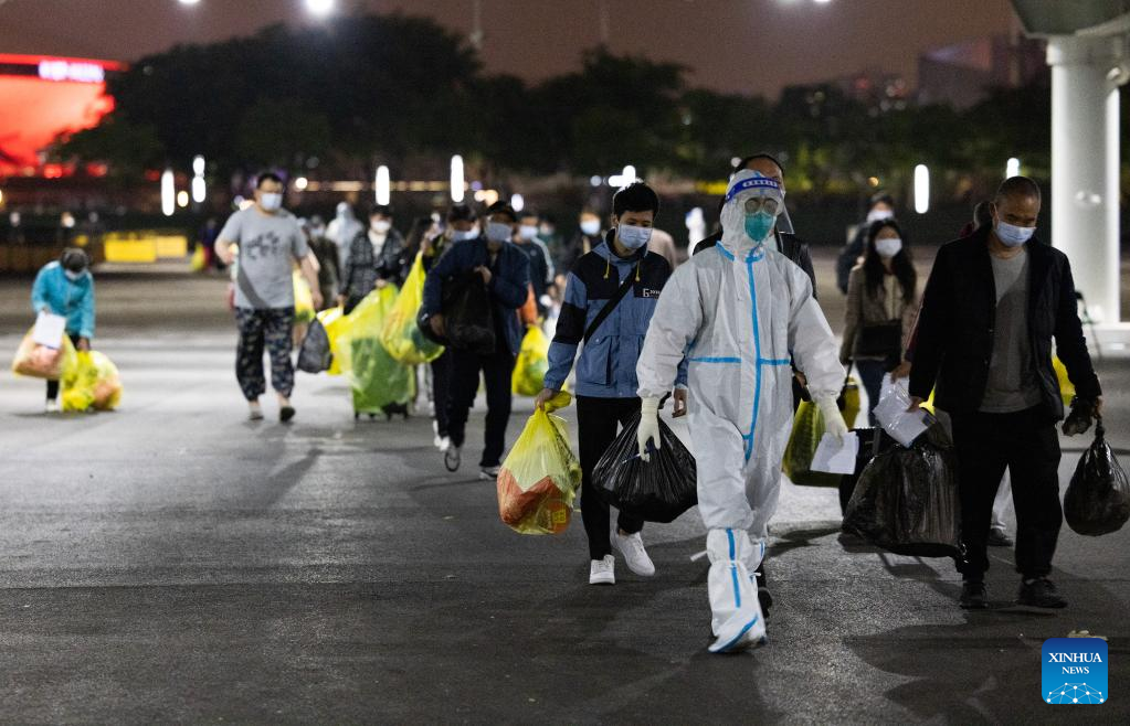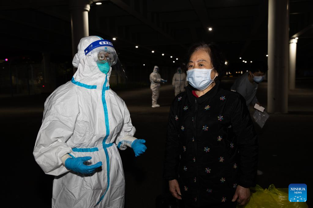 A medical worker leads recovered COVID-19 patients leaving a makeshift hospital in Shanghai, east China, April 23, 2022. Huang Dongfang, who lives in a three-and-a-half-story old apartment in Guangfu residential area, recovered from COVID-19 infection and returned her home on Saturday evening. (Xinhua/Jin Liwang)