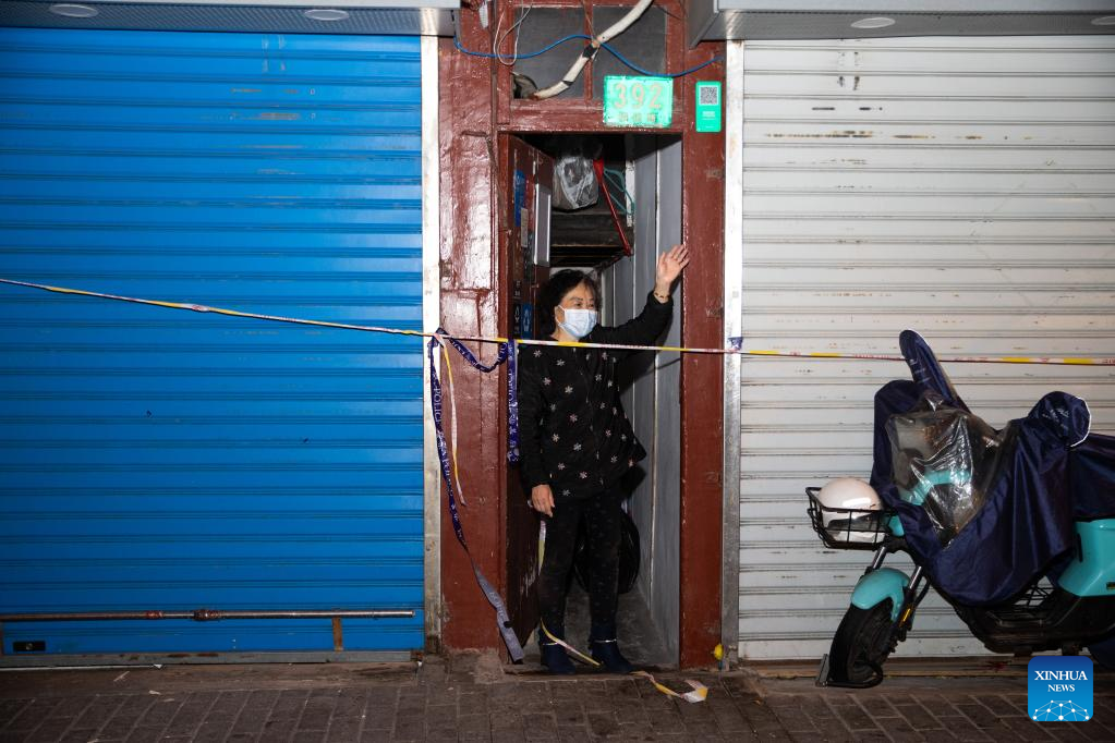 Huang Dongfang waves to people upon her arrival at Guangfu residential area in Huangpu District, Shanghai, east China, April 23, 2022. Huang Dongfang, who lives in a three-and-a-half-story old apartment in Guangfu residential area, recovered from COVID-19 infection and returned her home on Saturday evening. (Xinhua/Jin Liwang)