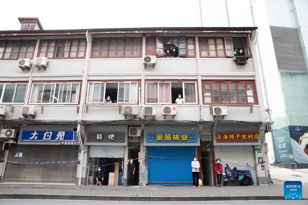 Residents pose for a group photo at Guangfu residential area in Huangpu District, Shanghai, east China, April 24, 2022. Huang Dongfang, who lives in a three-and-a-half-story old apartment in Guangfu residential area, recovered from COVID-19 infection and returned her home on Saturday evening. (Xinhua/Jin Liwang)