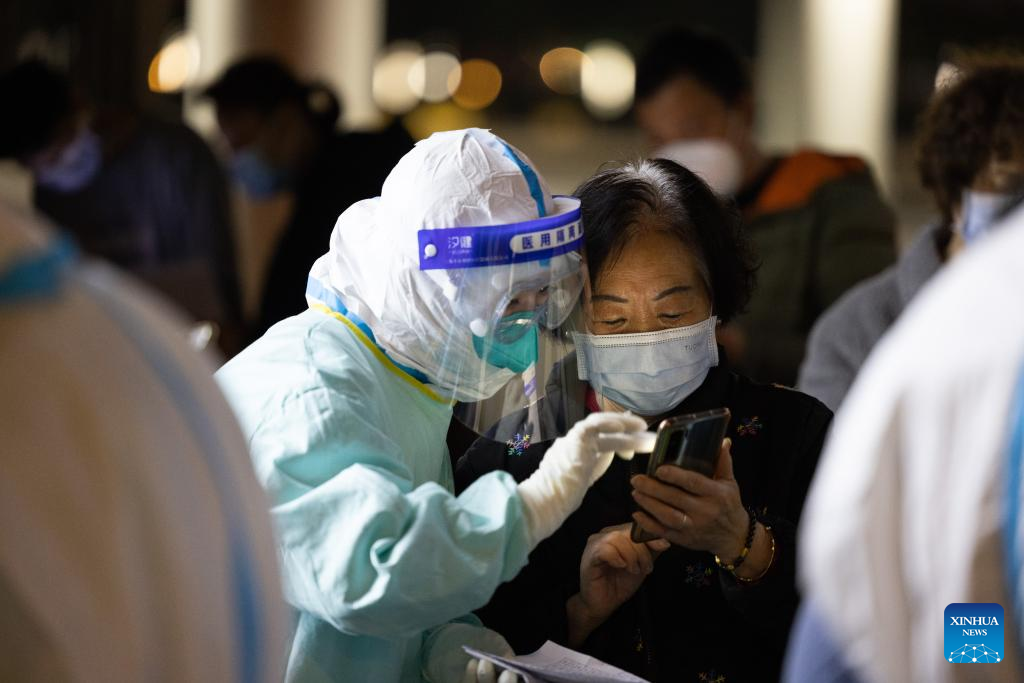 A medical worker helps Huang Dongfang regisiter on a smart phone at a makeshift hospital in Shanghai, east China, April 23, 2022. Huang Dongfang, who lives in a three-and-a-half-story old apartment in Guangfu residential area, recovered from COVID-19 infection and returned her home on Saturday evening. (Xinhua/Jin Liwang)