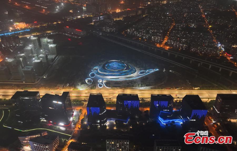 Aerial photo shows night view of China Hangzhou Esports Center, a venue of the 19th Asian Games Hangzhou 2022 in Hangzhou, east China's Zhejiang Province, April 24, 2022. The 19th Asian Games will be held in Hangzhou from September 10 to 25. (Photo: China News Service/Wang Gang)