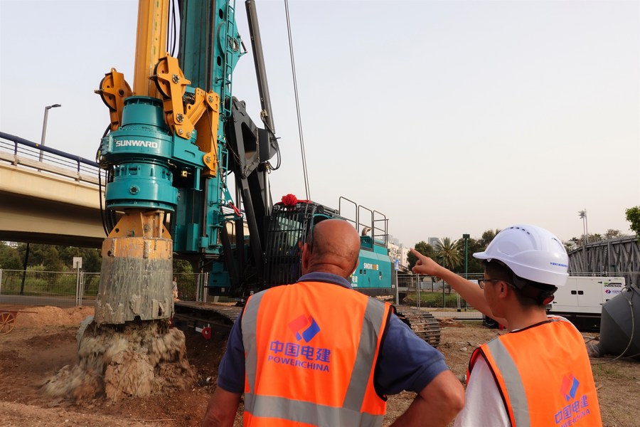 A Chinese constructor and an Israeli colleague work at the construction site of the Tel Aviv Light Rail Green Line in northern Tel Aviv, Israel, April 24, 2022. (Xinhua/Wang Zhuolun)