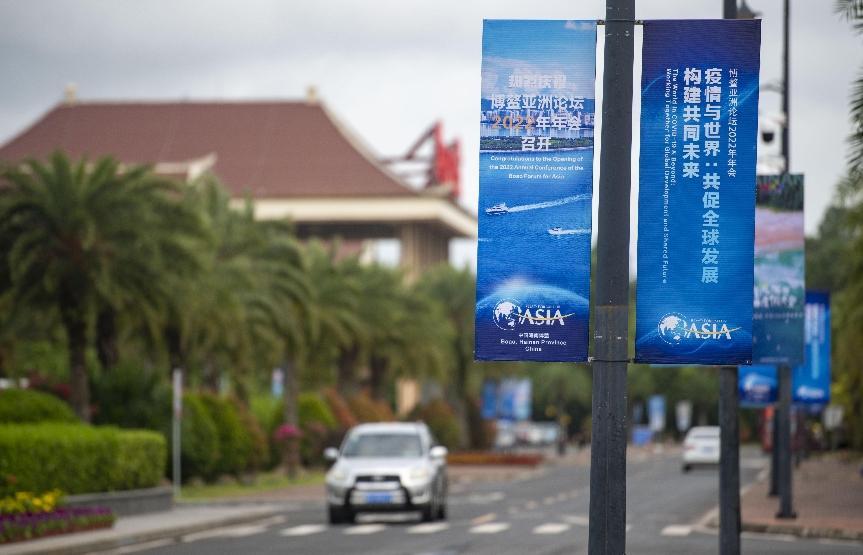 Photo taken on April 17 shows street lamp banners of the Boao Forum for Asia Annual Conference 2022 posted near the Boao airport in Qionghai, south China's Hainan province. (People's Daily Online/Meng Zhongde)