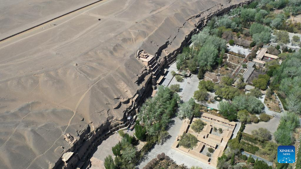 Aerial photo taken on April 18, 2022 shows the Mogao Grottoes in Dunhuang, northwest China's Gansu Province. Located in Dunhuang, northwest China's Gansu Province, the millennium-old Mogao Grottoes are home to a vast collection of Buddhist artworks which are considered the finest in existence -- more than 2,000 colored sculptures and 45,000 square meters of murals -- in 735 caves carved along a cliff by ancient worshippers.