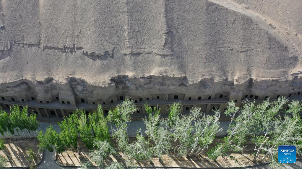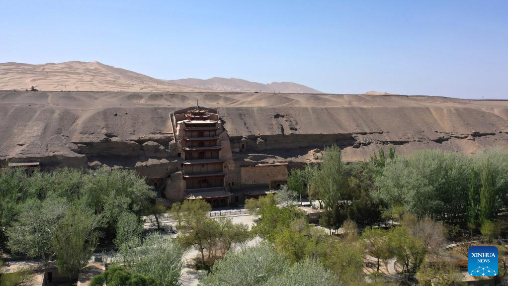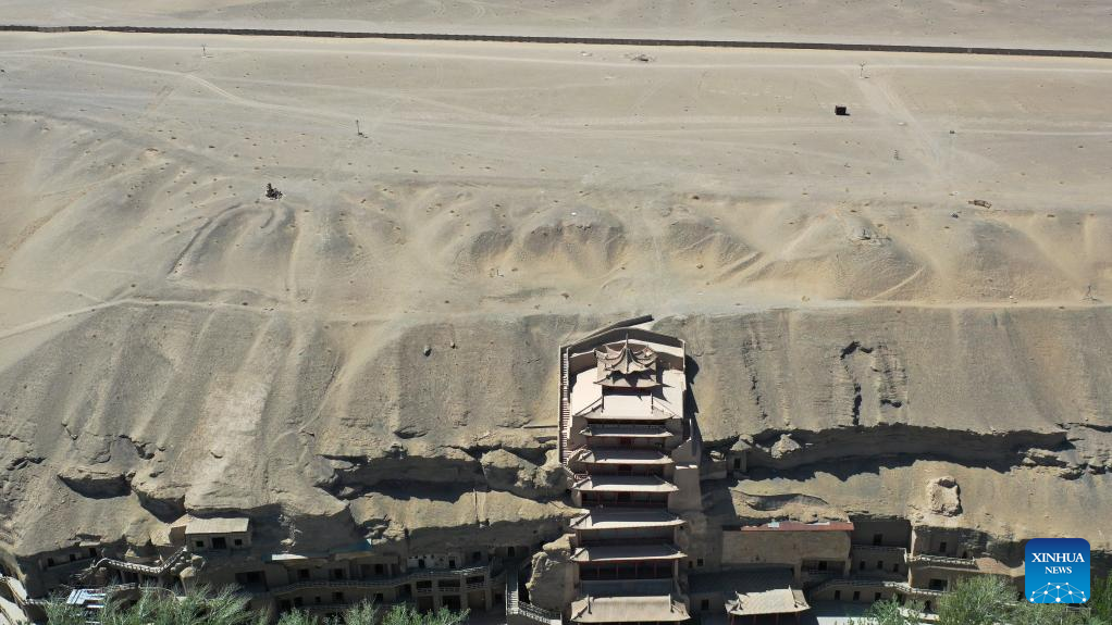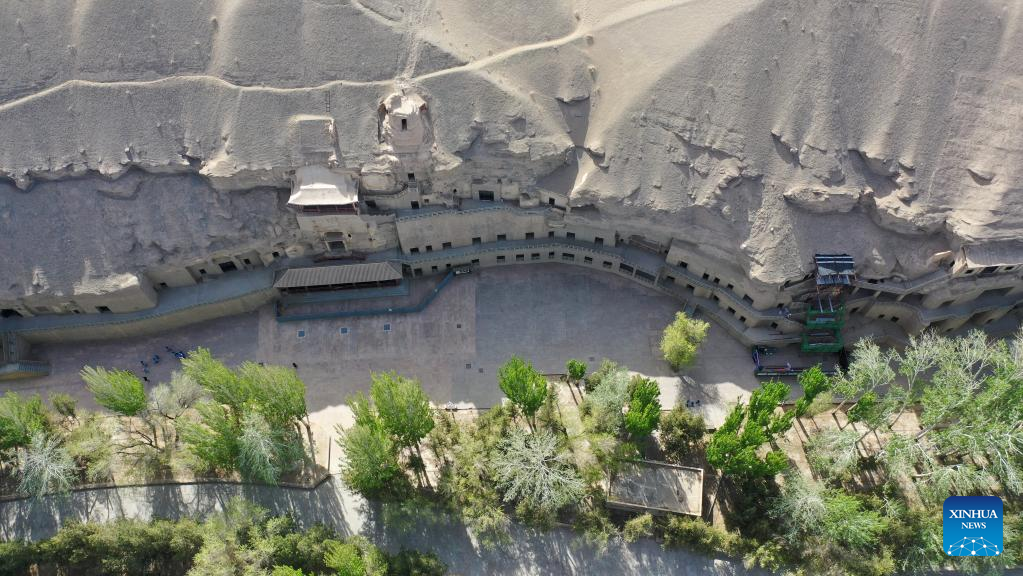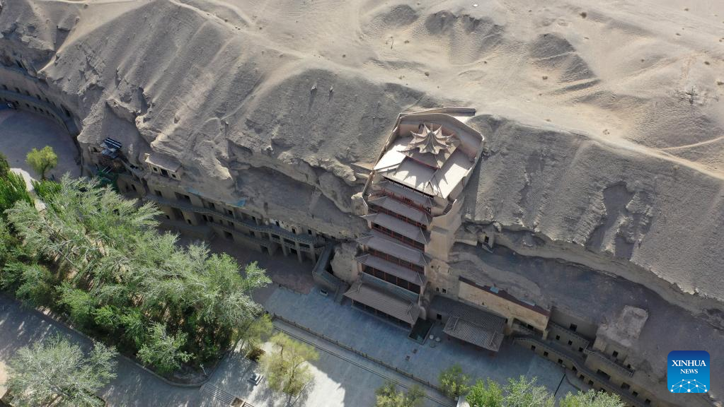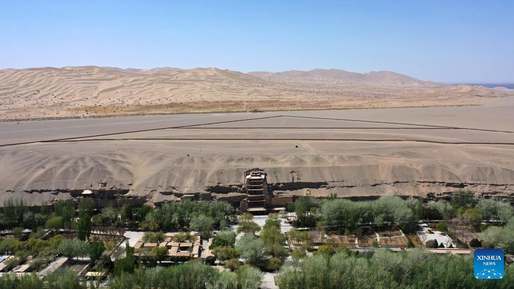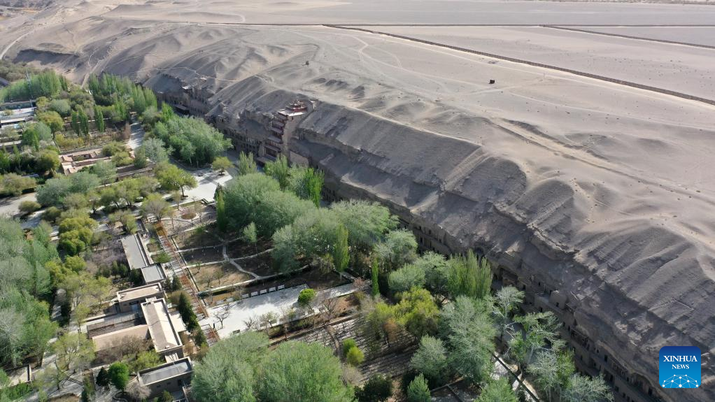 Aerial photo taken on April 18, 2022 shows the Mogao Grottoes in Dunhuang, northwest China's Gansu Province. Located in Dunhuang, northwest China's Gansu Province, the millennium-old Mogao Grottoes are home to a vast collection of Buddhist artworks which are considered one of the finest in existence -- more than 2,000 colored sculptures and 45,000 square meters of murals -- in 735 caves carved along a cliff by ancient worshippers.