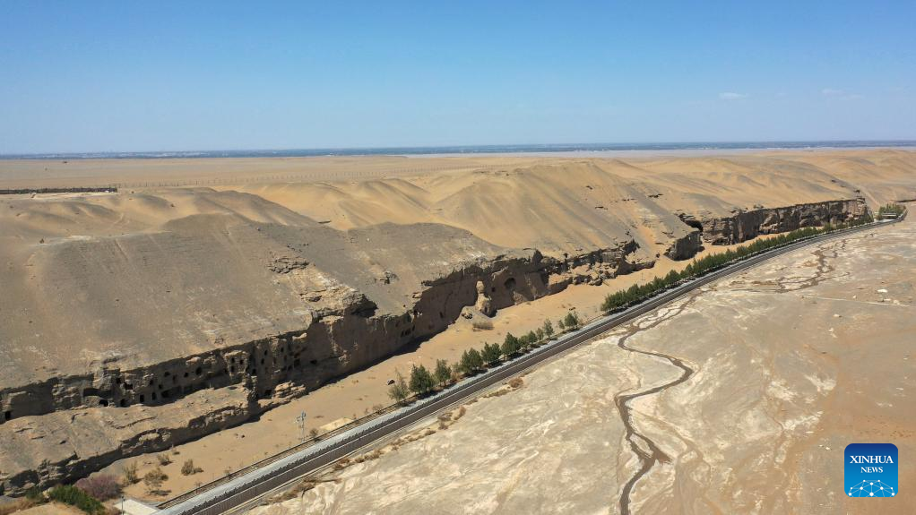 Aerial photo taken on April 18, 2022 shows the desert near the Mogao Grottoes in Dunhuang, northwest China's Gansu Province. Located in Dunhuang, northwest China's Gansu Province, the millennium-old Mogao Grottoes are home to a vast collection of Buddhist artworks which are considered the finest in existence -- more than 2,000 colored sculptures and 45,000 square meters of murals -- in 735 caves carved along a cliff by ancient worshippers.