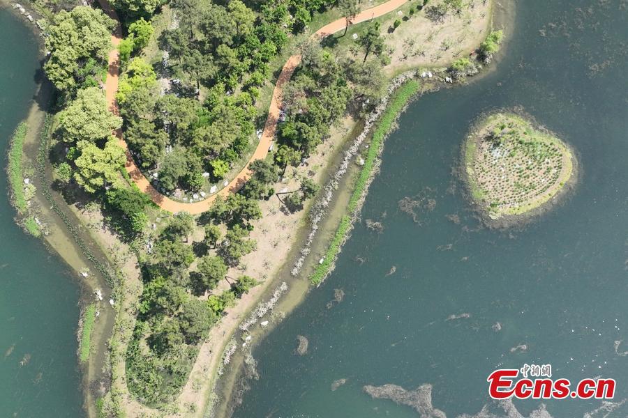 Aerial photo shows a heart-shaped island in Taohu Lake Park, Nanjing, east China's Jiangsu Province, April 24, 2022. The Taohu Lake Park opened to the public in 2021 and was built to protect the water quality of the Yangtze River. (Photo: China News Service/Yang Bo)