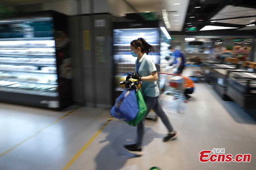 A staff member prepares online ordered goods at a Hema Fresh store in Chaoyang district, Beijing, April 26, 2022. (Photo: China News Service/Fu Tian)