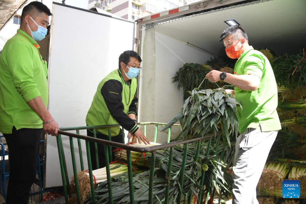 Staff members transport green onion at a distribution center of a supermarket in Beijing, capital of China, April 26, 2022.