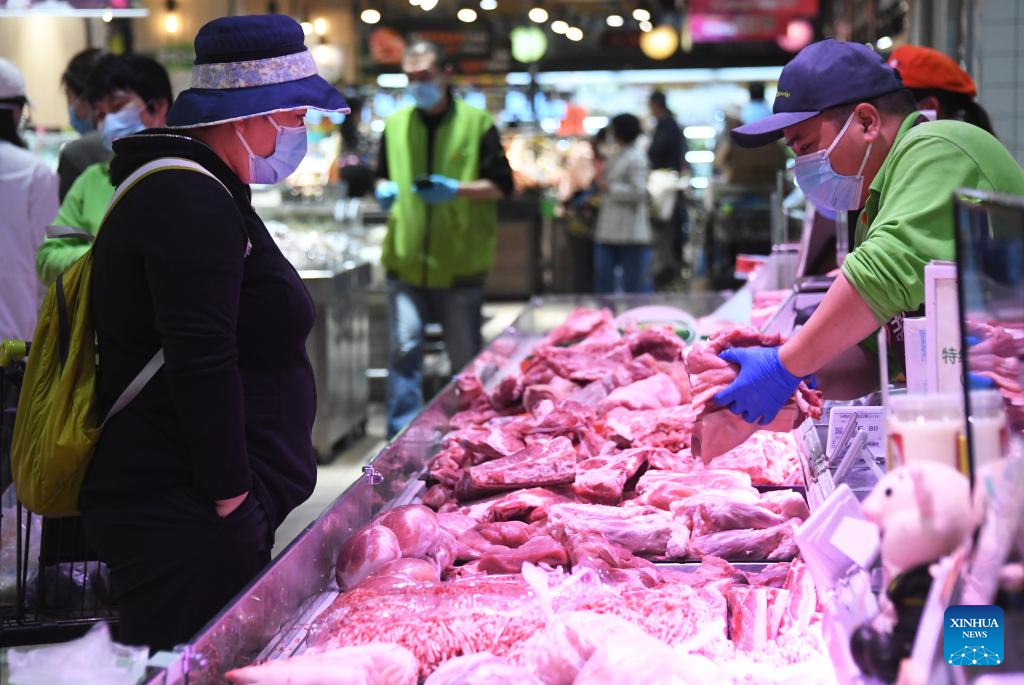 A citizen selects meat at a supermarket in Haidian District, Beijing, capital of China, April 26, 2022.