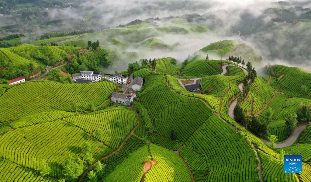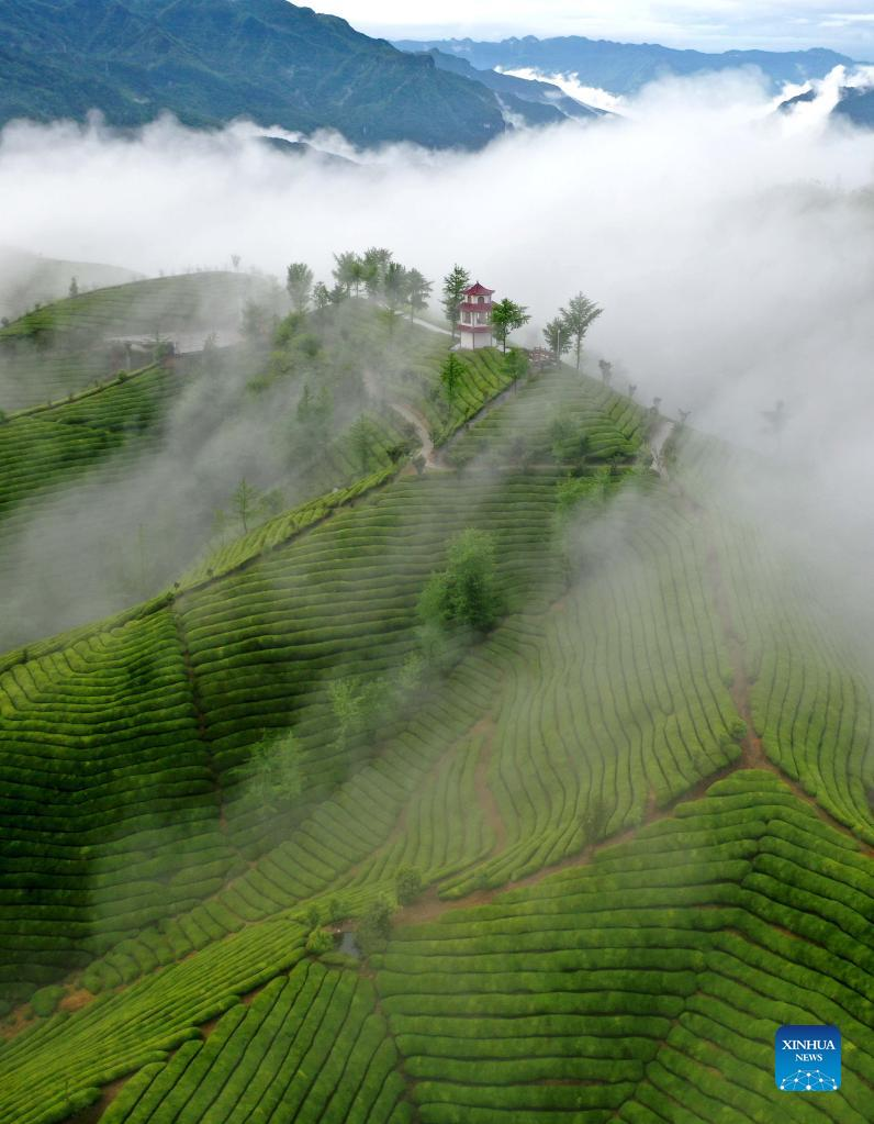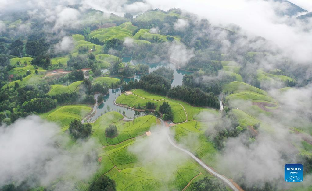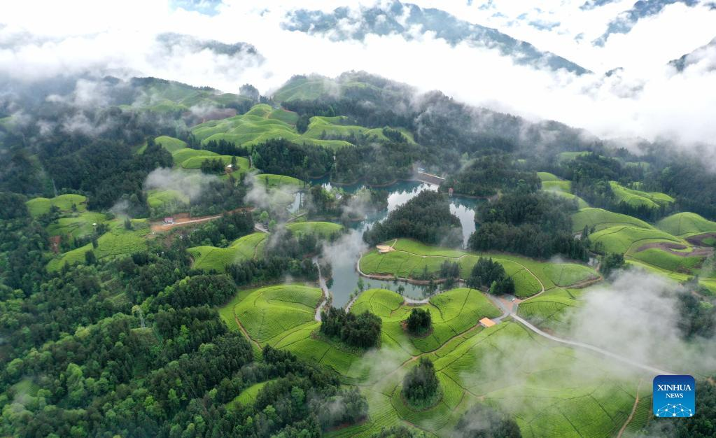Aerial photo taken on April 26, 2022 shows the view of a tea garden in Enshi Tujia and Miao Autonomous Prefecture, central China's Hubei Province. (Photo by Yang Shunpi/Xinhua)
