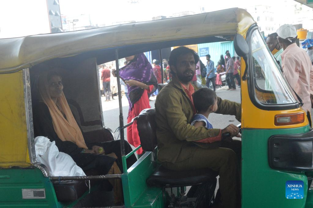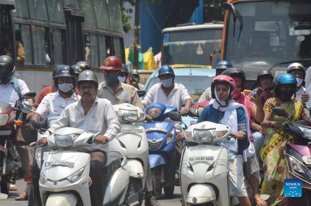 People ride on the road in Bangalore, India, April 26, 2022. After local governments across India lifted all the pandemic related restrictions and even dropped the mandatory wearing of face masks, the country is once again witnessing an increase in the daily number of COVID-19 infections. On Tuesday, 2,483 new cases were recorded during a 24-hour time span. (Str/Xinhua)