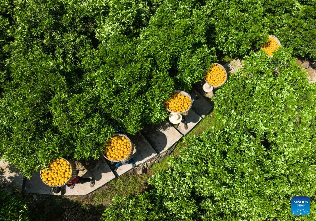 Villagers harvest oranges in Zigui County, C China's Hubei (4)