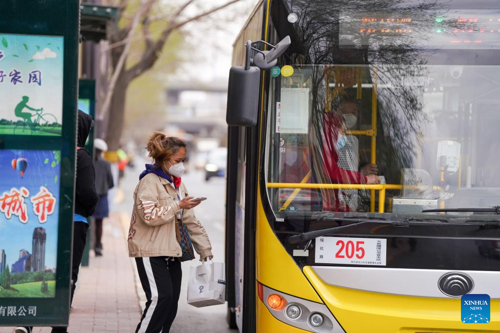 Citizens get on a bus in Harbin, northeast China's Heilongjiang Province, April 26, 2022. Harbin has updated its epidemic control and prevention measures from April 26 to 29 in six districts including Daoli, Daowai, Nangang, Xiangfang, Pingfang and Songbei, according to local authority.
