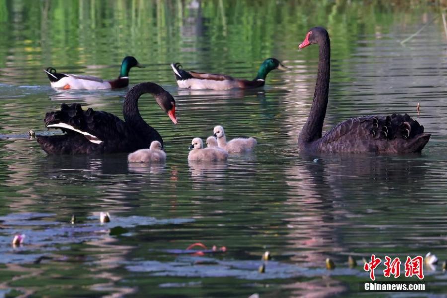 A pair of black swans and their babies swim in the Yanque Lake in Nanjing, east China's Jiangsu Province, April 26, 2022. (Photo: China News Service/Yang Bo)