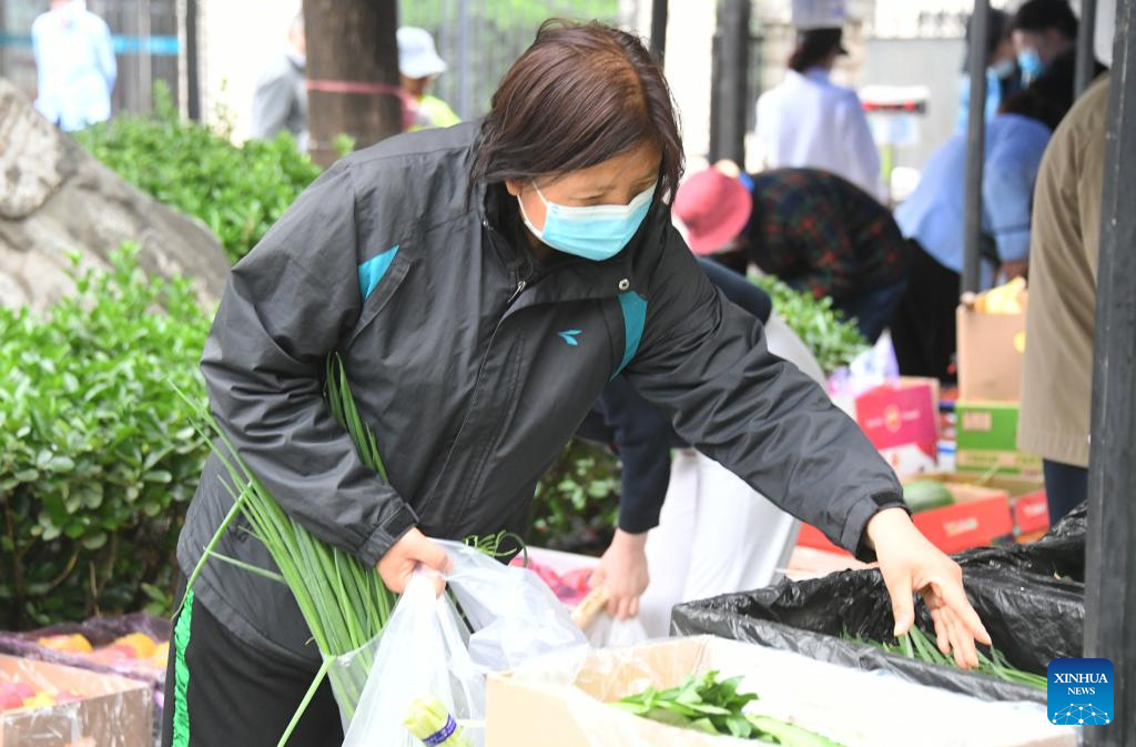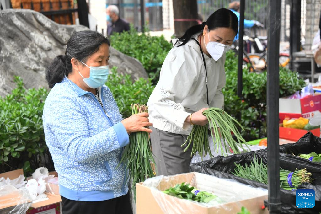 Residents select vegetables at a residential area in Haidian District, Beijing, capital of China, April 27, 2022. Communities in Haidian District have strengthened the supply of daily necessities for residents following a recent COVID-19 resurgence. (Xinhua/Ren Chao)