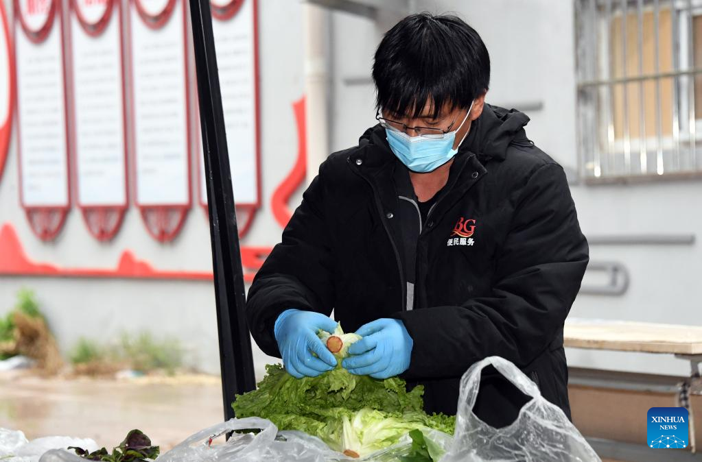 A staff member prepares vegetables at a residential area in Haidian District, Beijing, capital of China, April 27, 2022. Communities in Haidian District have strengthened the supply of daily necessities for residents following a recent COVID-19 resurgence. (Xinhua/Ren Chao)
