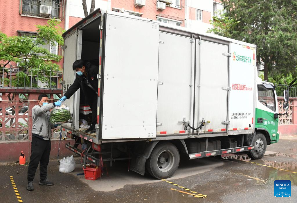 Staff members unload vegetables from a truck at a residential area in Haidian District, Beijing, capital of China, April 27, 2022. Communities in Haidian District have strengthened the supply of daily necessities for residents following a recent COVID-19 resurgence. (Xinhua/Ren Chao)
