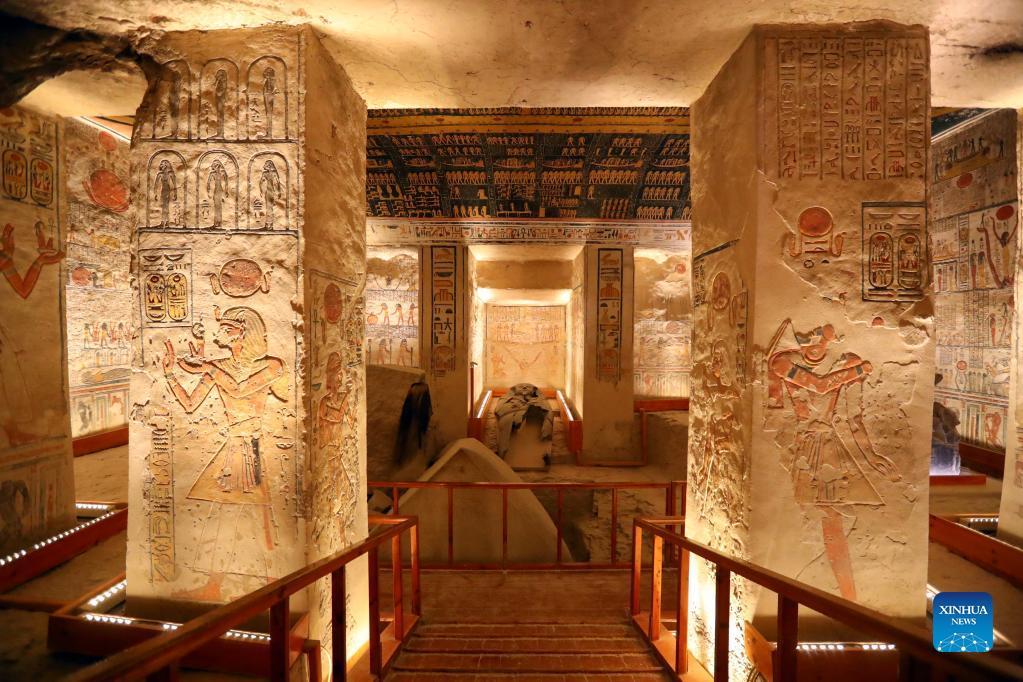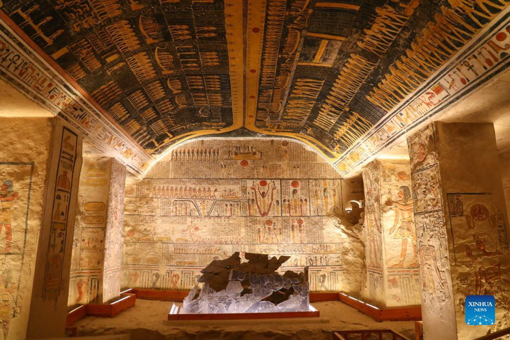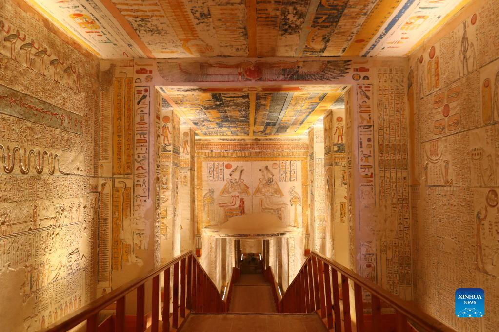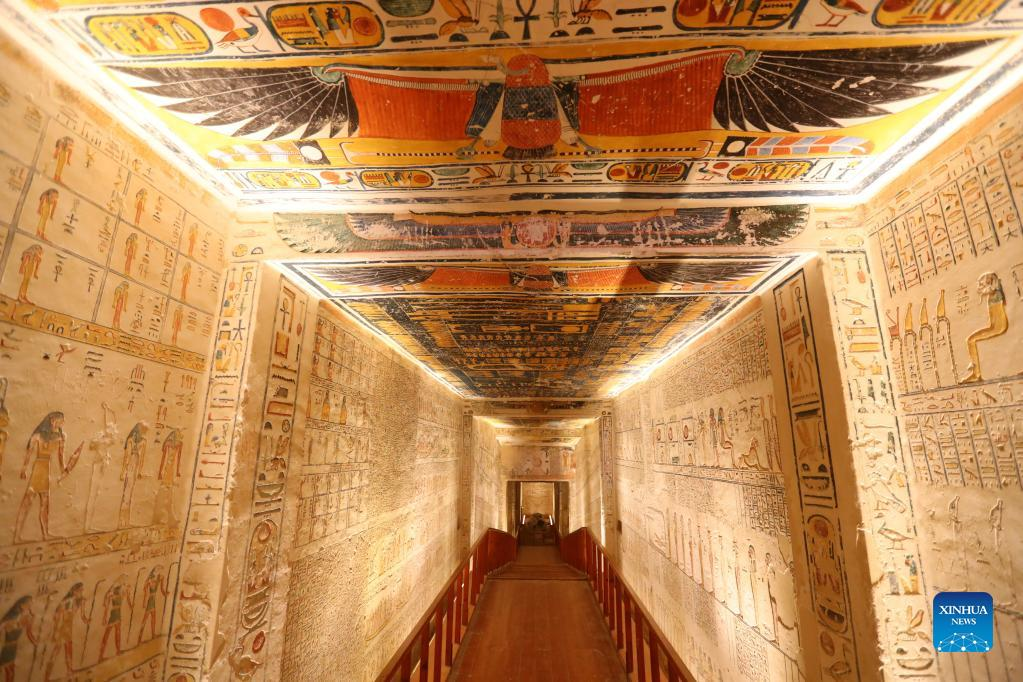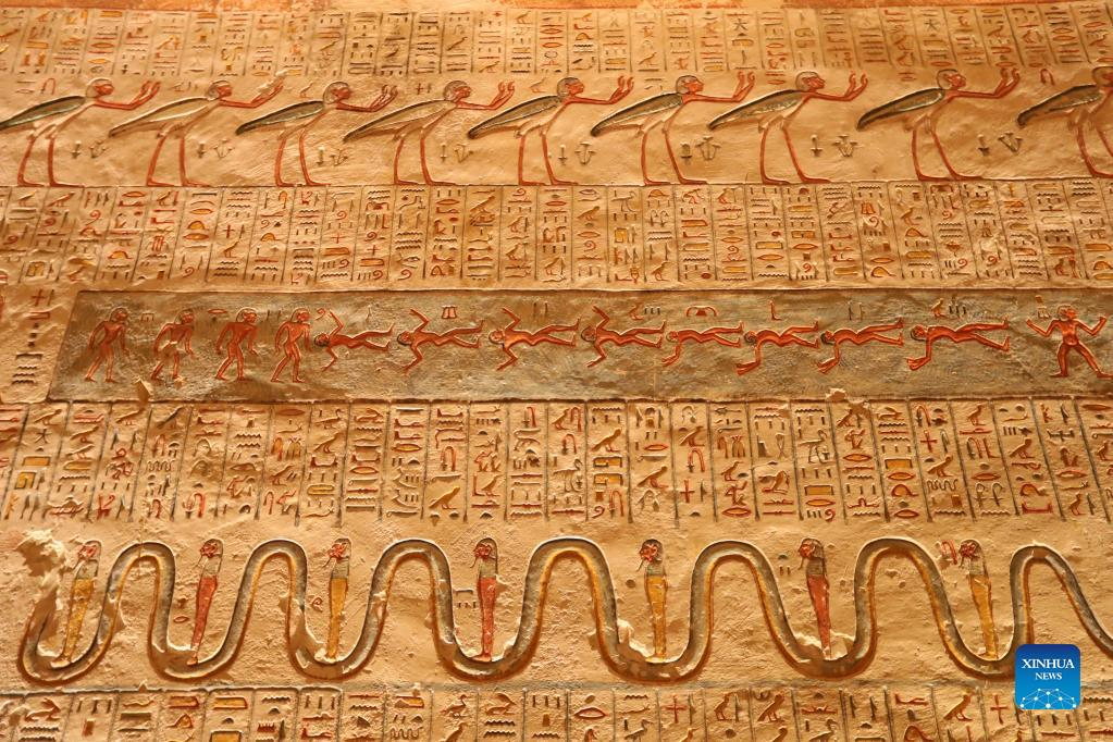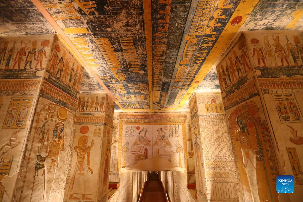 Photo taken on April 26, 2022 shows colorful reliefs and murals inside the tomb of Ramesses VI in the Valley of the Kings in Luxor, Egypt. The tomb of Ramesses VI, a ruler of the 20th Dynasty in ancient Egypt, is one of the most beautiful and well-preserved tombs in the Valley of the Kings. (Xinhua/Sui Xiankai)
