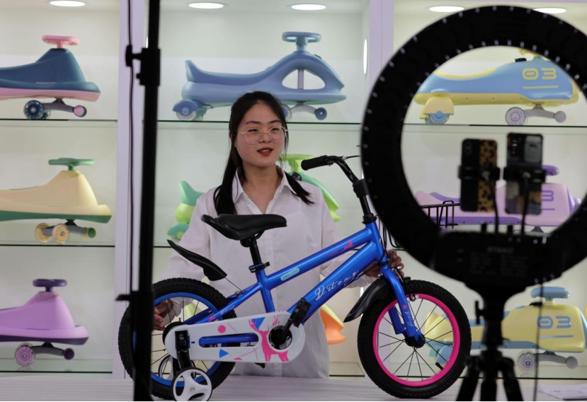 An employee with Hebei Tieniu Bicycle Industry Co., Ltd. based in Guangzong county, Xingtai city, north China’s Hebei province, sells bicycles for children via livestreaming during the 131st China Import and Export Fair, April 21, 2022. (People’s Daily Online/Wang Lei)