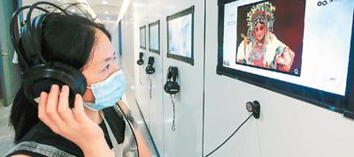 A visitor watches a video featuring Huizhou Opera in a museum in east China’s Anhui Province. (Photo/Shi Yalei)