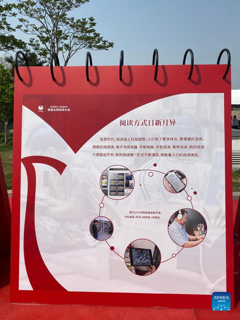 A board displaying new forms of reading is pictured during the first National Conference on Reading in Beijing, capital of China, April 23, 2022. (Xinhua/Luo Xin)