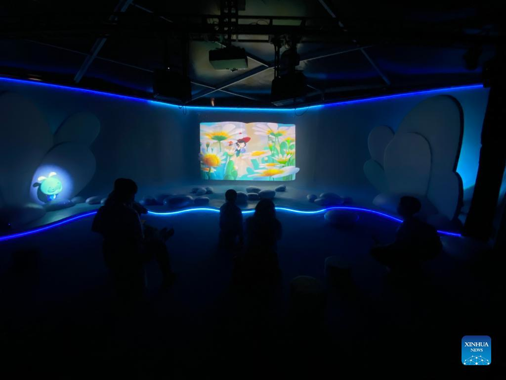 People visit a hall showcasing holographic reading technologies for children during the first National Conference on Reading in Beijing, capital of China, April 23, 2022. (Xinhua/Luo Xin)