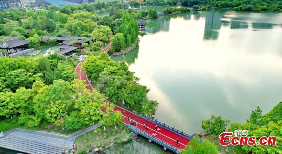 People exercise on the newly-built trail at Zhangjiang National Wetland Park, Ganzhou, east China's Jiangxi Province. Colored trail winding along the lakeshore looks like a red ribbon at the park. (Photo: China News Service/Zhu Haipeng)
