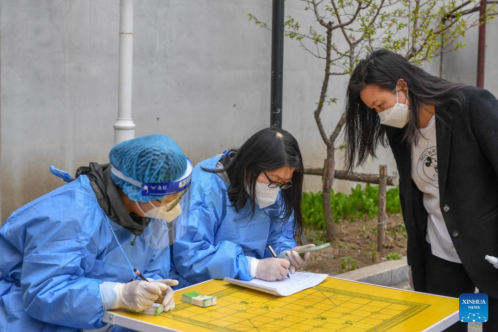 Staff members fill a pass card for a resident in Jilin City, northeast China's Jilin Province, April 28, 2022.