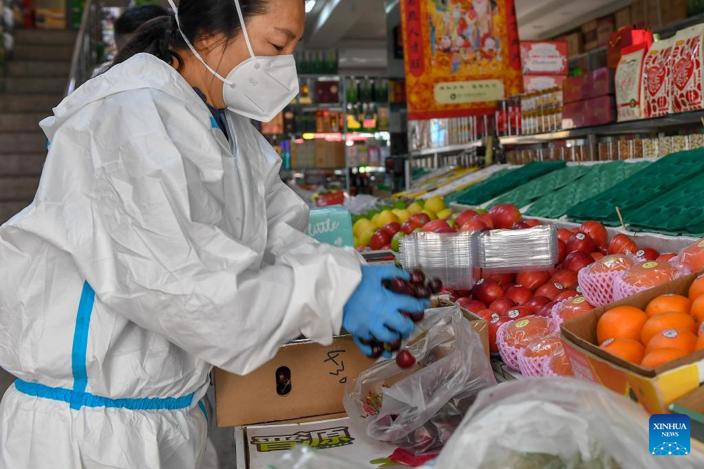 A saleswoman packs fruits at a market in Jilin City, northeast China's Jilin Province, April 28, 2022.