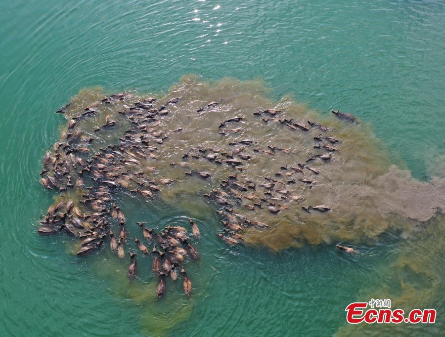 Spectacular view of a herd of buffaloes crossing the Jialing River to forage on Taiyang island, Peng'an county, southwest China's Sichuan Province, April 29, 2022. (Photo: China News Service/Liu Yonghong)