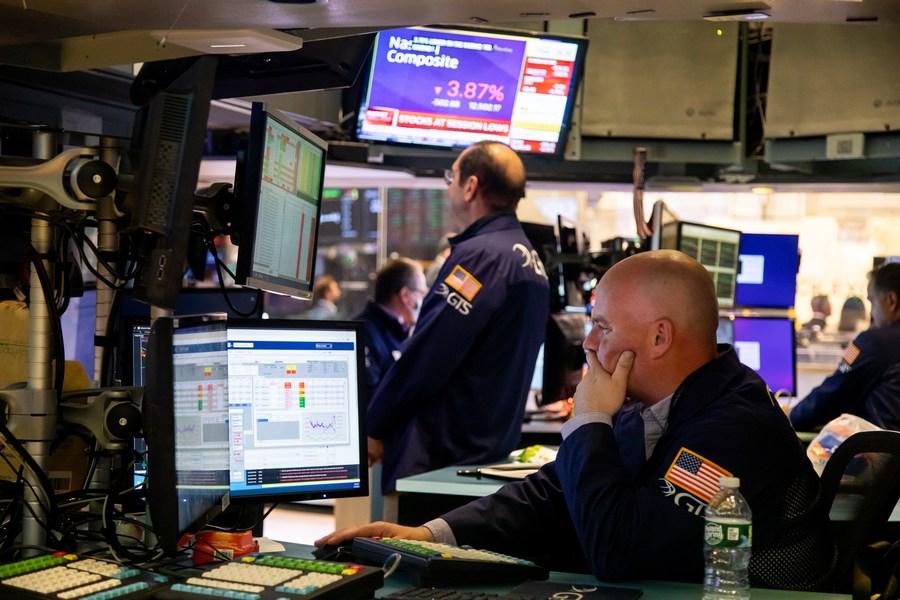 Traders work on the floor of the New York Stock Exchange (NYSE) in New York, the United States, April 26, 2022.(Photo by Michael Nagle/Xinhua)
