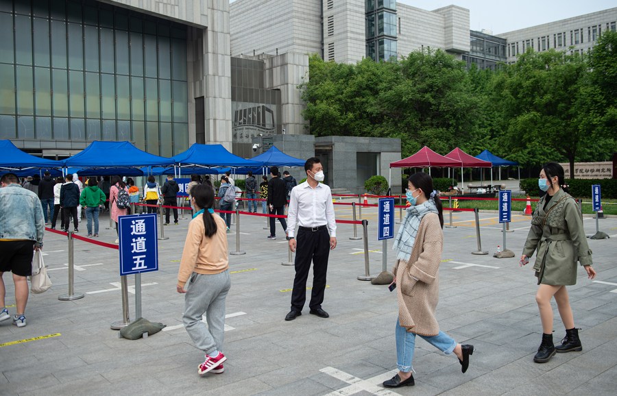 Residents line up for nucleic acid testing at Aoyuncun Subdistrict in Chaoyang District, Beijing, capital of China, April 29, 2022. (Xinhua/Chen Zhonghao)
