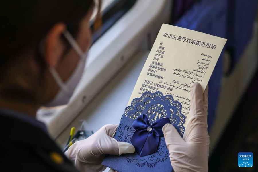 A train attendant studies the reference for Uygur language and Mandarin Chinese translation aboard a slow train running in northwest China's Xinjiang Uygur Autonomous Region, April 29, 2022.
