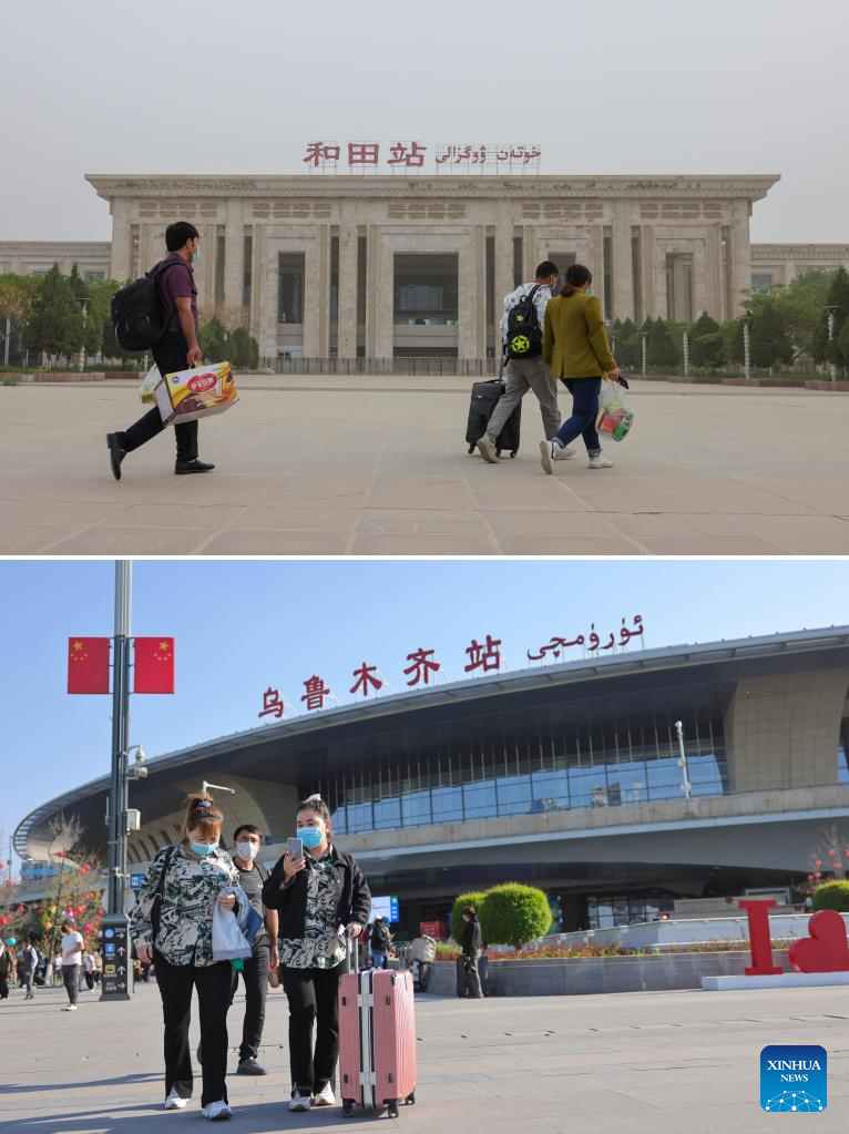 This combo photo shows (top) passengers walking to Hotan Railway Station in Hotan, northwest China's Xinjiang Uygur Autonomous Region, April 28, 2022 , and (bottom) passengers walking out of Urumqi Railway Station in Urumqi, northwest China's Xinjiang Uygur Autonomous Region, April 29, 2022,