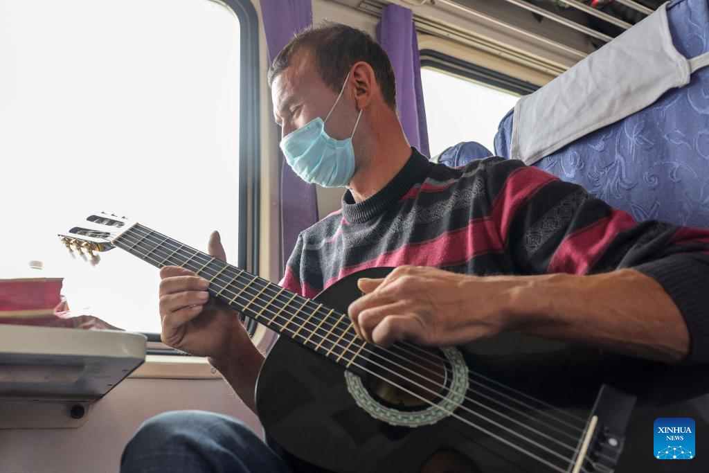 A passenger plays the guitar aboard a slow train bound for Hotan in northwest China's Xinjiang Uygur Autonomous Region, April 27, 2022.