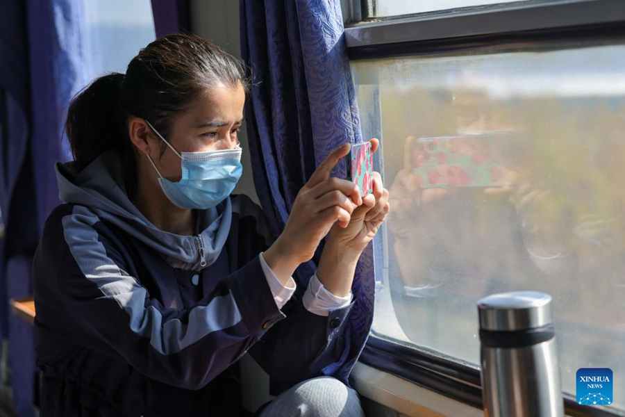Passengers take selfies aboard a slow train bound for Urumqi in northwest China's Xinjiang Uygur Autonomous Region, April 29, 2022.