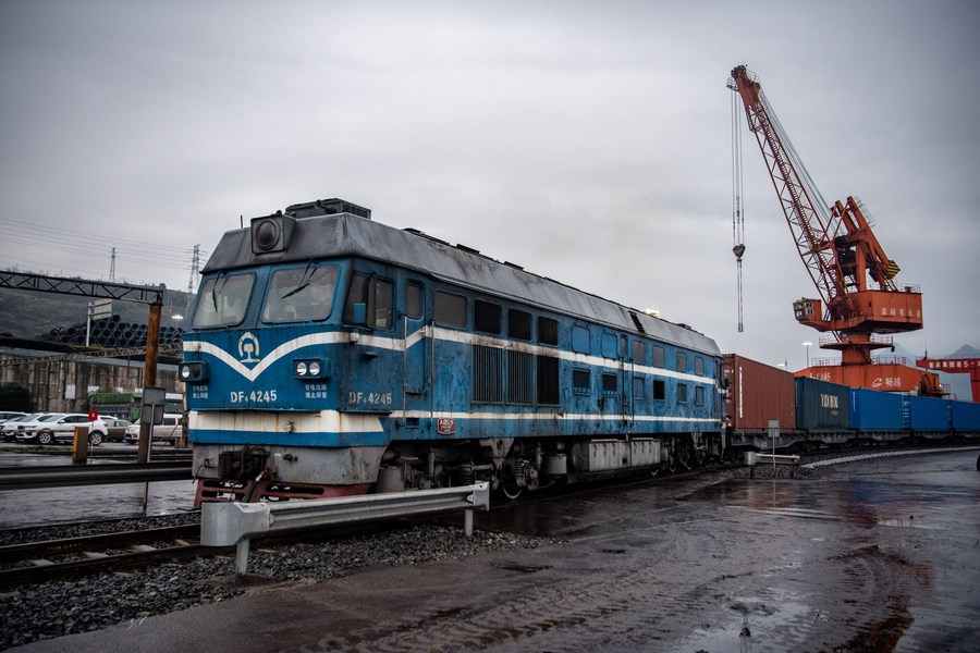 A China-Europe freight train is towed into Guoyuan Port in Chongqing, southwest China, Feb. 19, 2022. (Xinhua/Tang Yi)