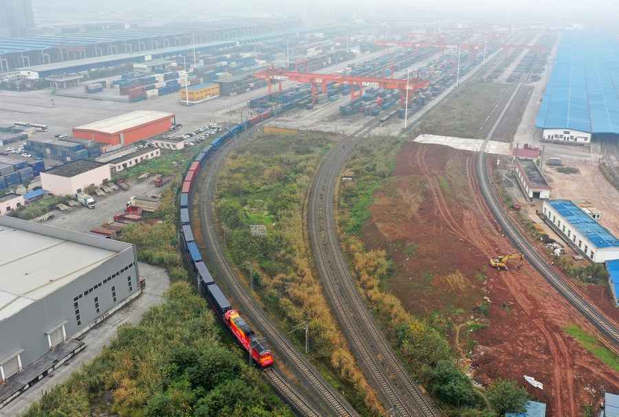 Aerial photo shows a China-Europe freight train bound for Duisburg of Germany departing from Tuanjiecun Station in southwest China's Chongqing, Jan. 1, 2021. (Xinhua/Tang Yi)