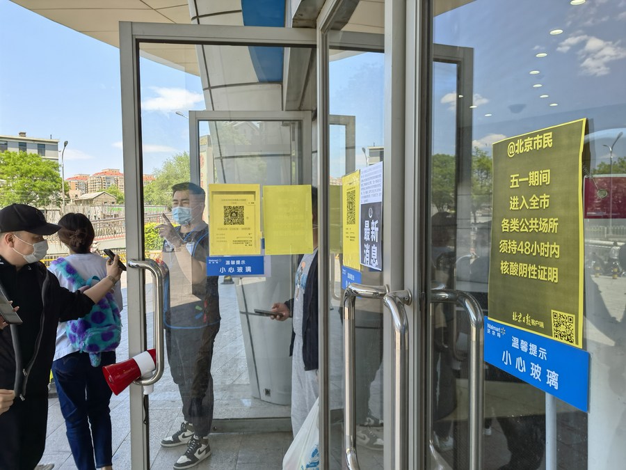 A staff member checks consumers' negative results of nucleic acid tests taken within 48 hours at the entrance of a supermarket in Beijing, capital of China, May 1, 2022. (Xinhua/Li Xin)