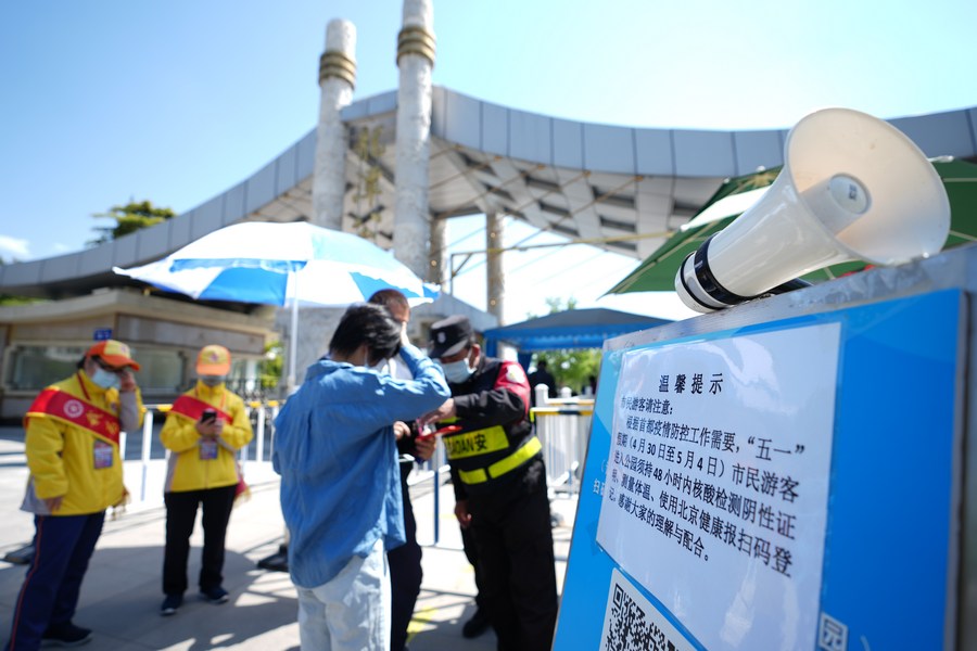 A notice is seen showing that a negative nucleic acid test result within 48 hours is required to enter the Longtan Park during the Labor Day holiday in Beijing, capital of China, April 30, 2022. (Xinhua/Ju Huanzong)