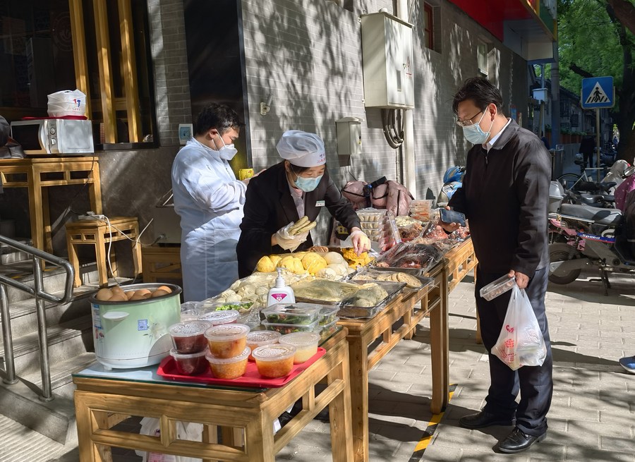 Photo taken with a mobile phone shows a resident buying breakfast outside a restaurant after suspension of eat-in services in Beijing, capital of China, May 1, 2022. (Xinhua/Li Xin)