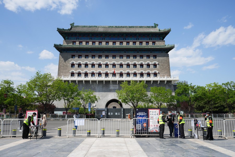 Staff members check tourists' negative results of nucleic acid tests taken within 48 hours at Qianmen street in Beijing, capital of China, April 30, 2022. (Xinhua/Ju Huanzong)