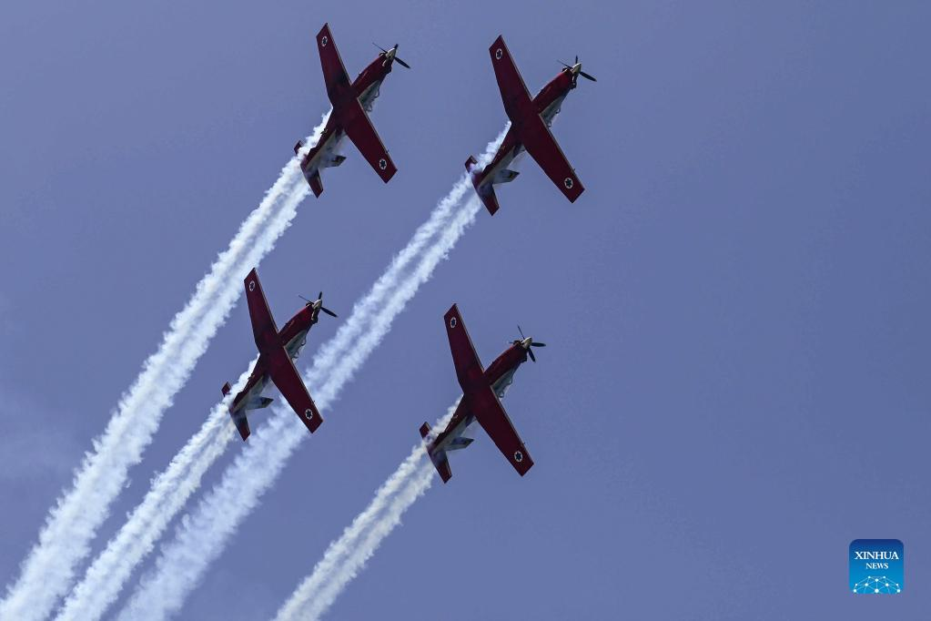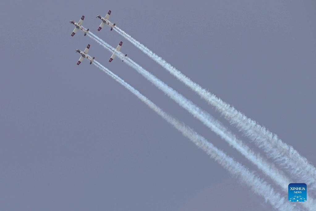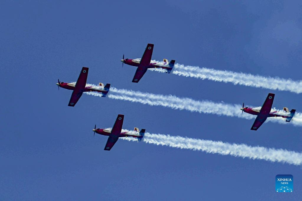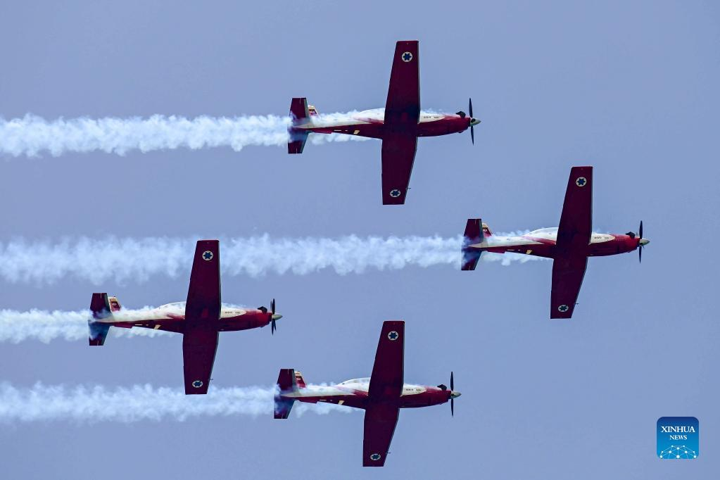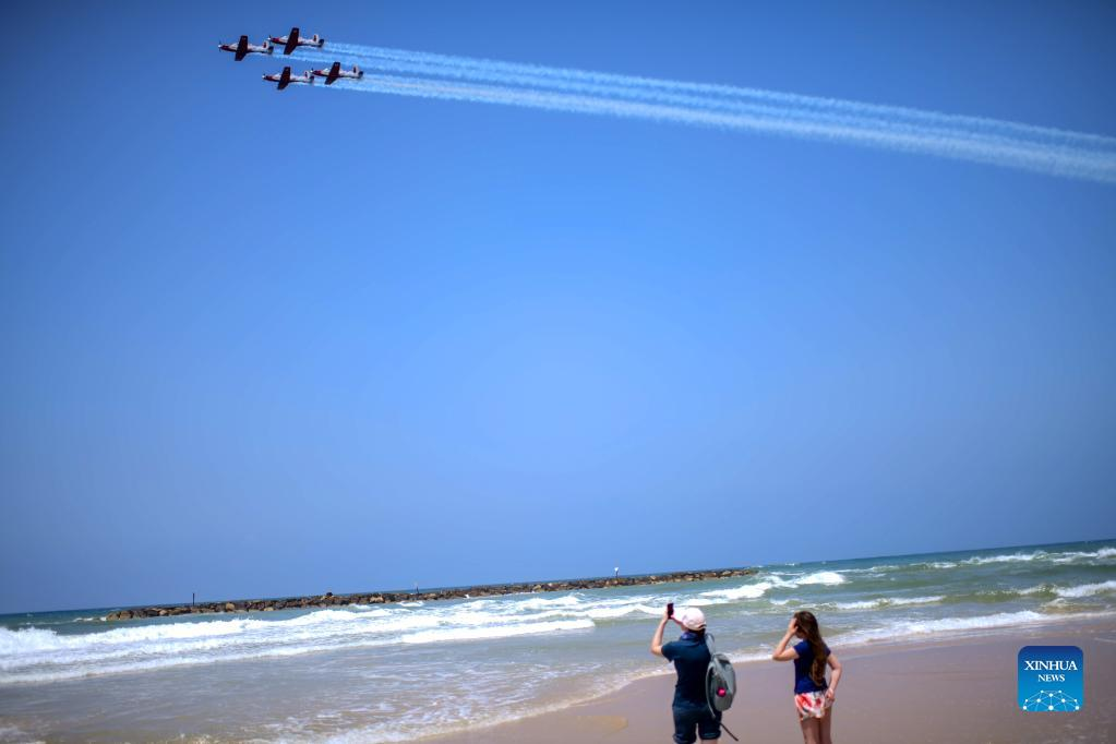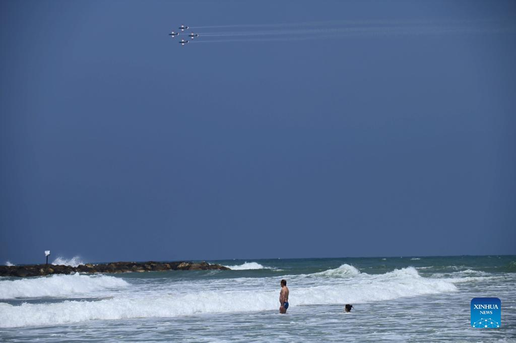Israeli air force aerobatic team flies during a training for the upcoming Independence Day celebrations in Tel Aviv, Israel, on May 1, 2022. (Tomer Neuberg/JINI via Xinhua)