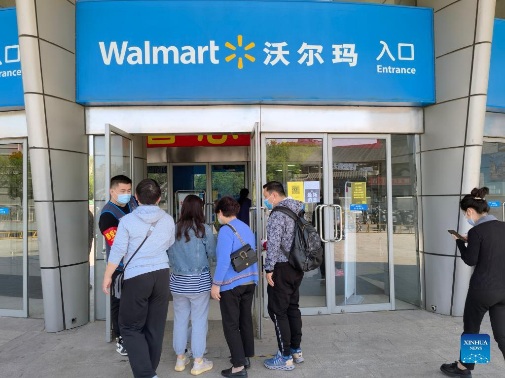 A staff member checks the nucleic acid test results of customers outside a Walmart store in Beijing, capital of China, May 1, 2022. A negative nucleic acid test result within 48 hours is required to enter public venues during the Labor Day holiday in Beijing. (Xinhua/Li Xin)