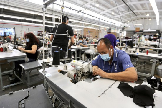 Workers make face masks at a face mask factory in the City of Vernon, Los Angeles County, California, the United States, April 16, 2020. (Xinhua)